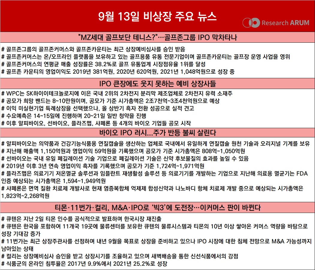 제목 2022년 9월 13일 비상장 주요 뉴스
