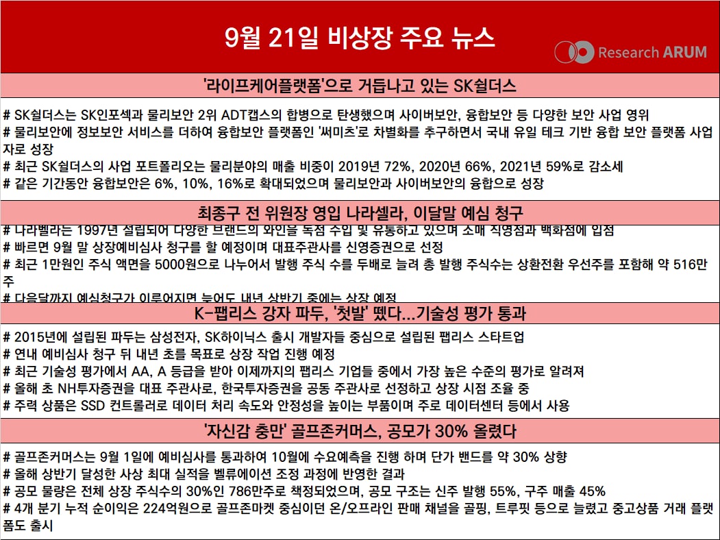 제목 2022년 9월 21일 비상장 주요 뉴스