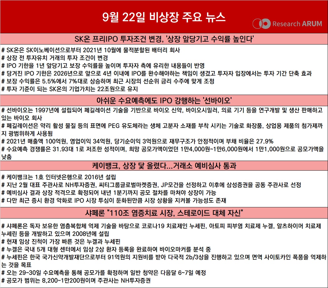 제목 2022년 9월 22일 비상장 주요 뉴스