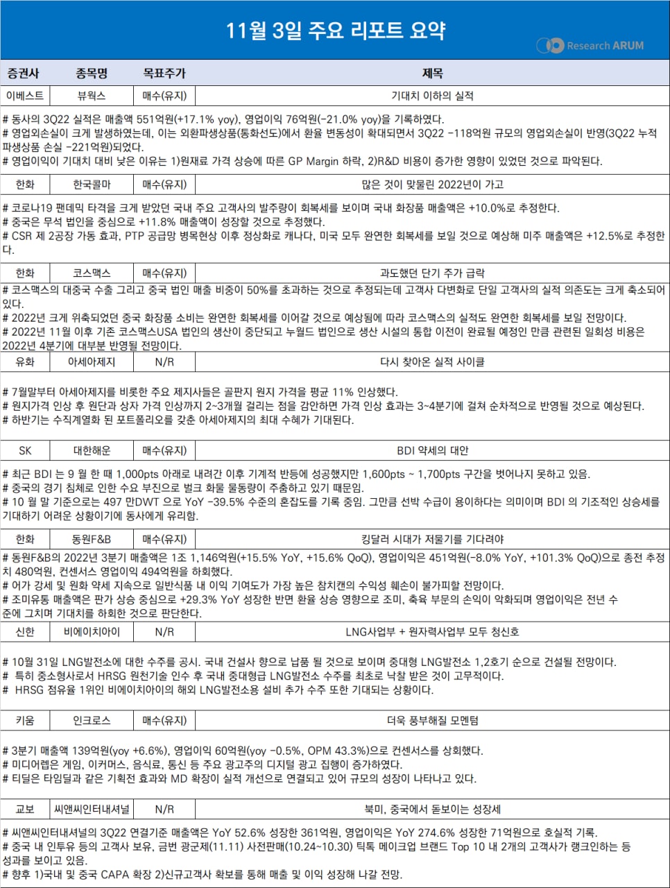제목 2022년 11월 3일 주요 리포트 요약