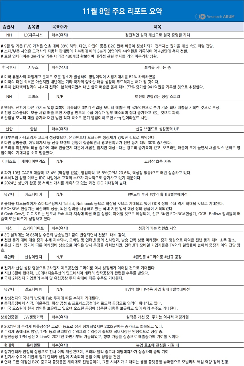 제목 2022년 11월 8일 주요 리포트 요약