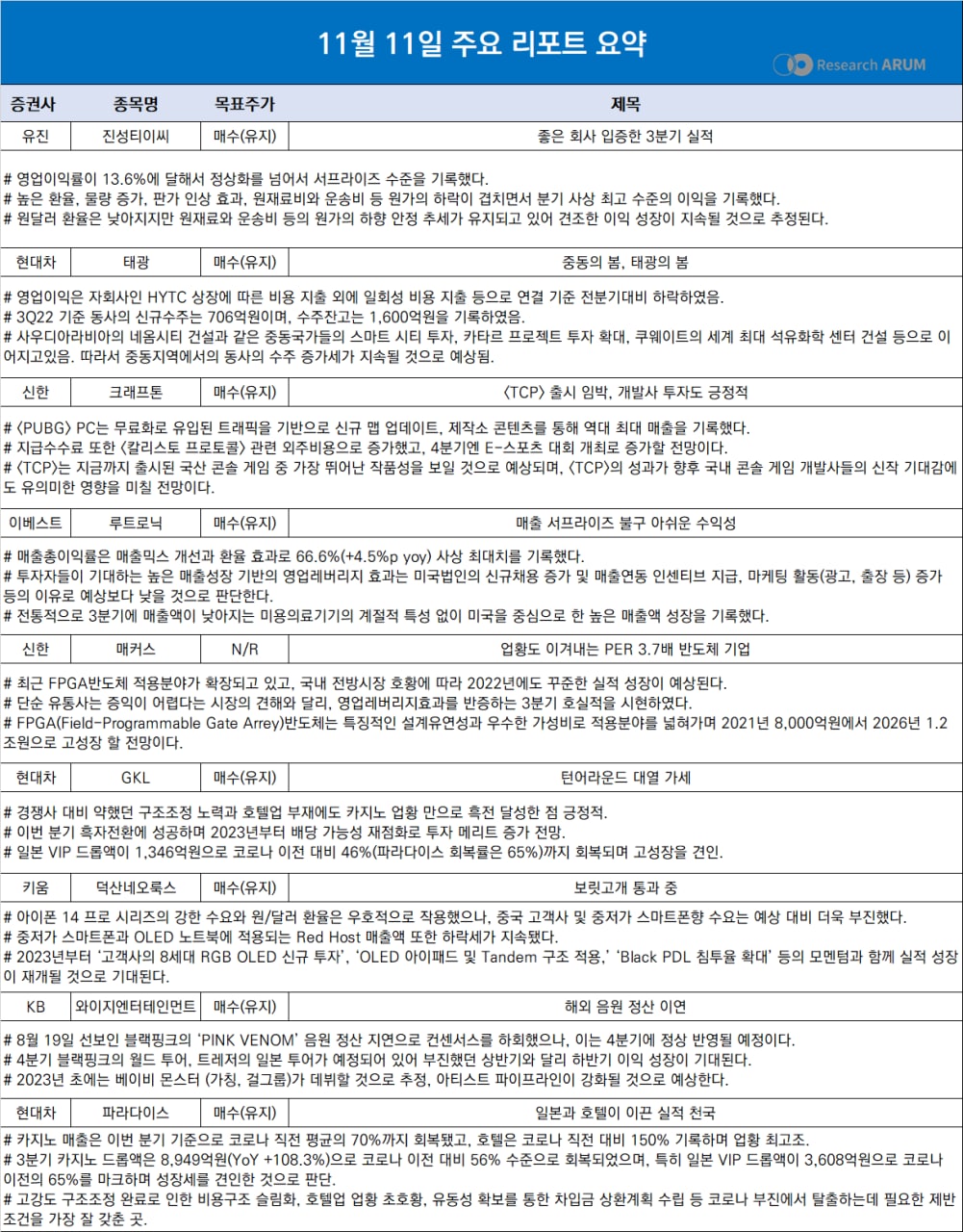 제목 2022년 11월 11일 주요 리포트 요약