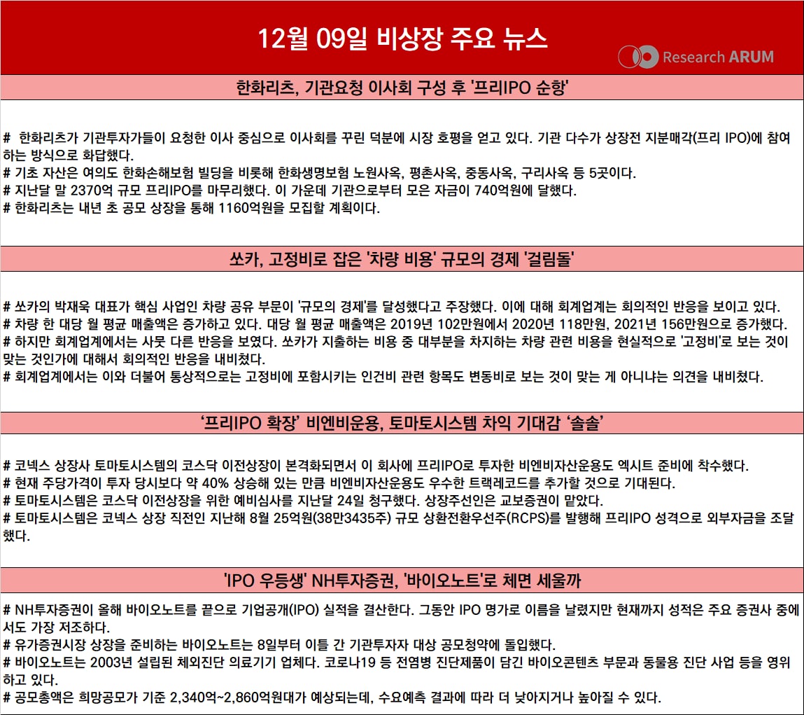 제목 2022년 12월 09일 비상장 주요 뉴스
