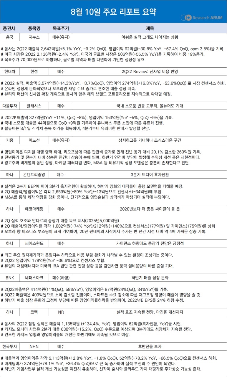 제목 2022년 8월 10일 주요 리포트 요약