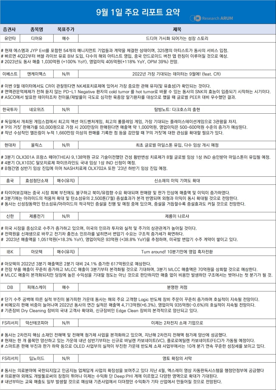 제목 2022년 9월 1일 주요 리포트 요약