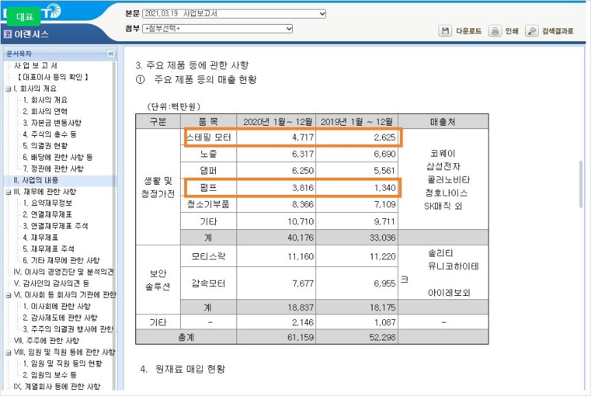 이랜시스는 코웨이랑 노비타 등 향으로 핵심부품(모터, 펌프, 노즐 등)을 수출하고 있습니다.